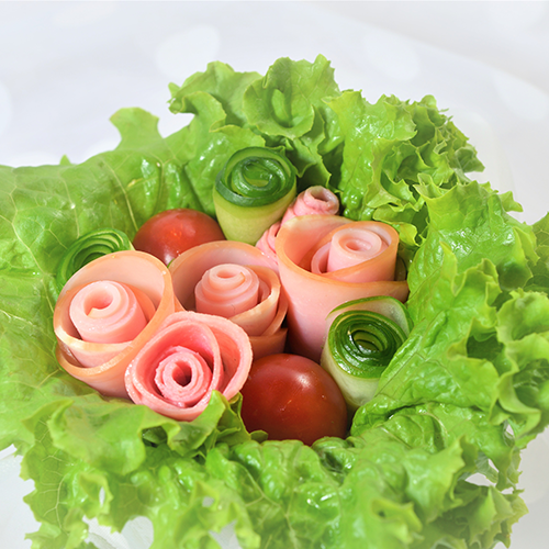 <原材料名>豚もも肉(輸入)、食塩、糖類(砂糖、どう糖、水あめ)/リン酸塩(Na)、調味料(アミノ酸)、酸化防止剤(ビタミンC)、発色剤(亜硝酸Na)、香辛料抽出物、(一部に豚肉を含む)